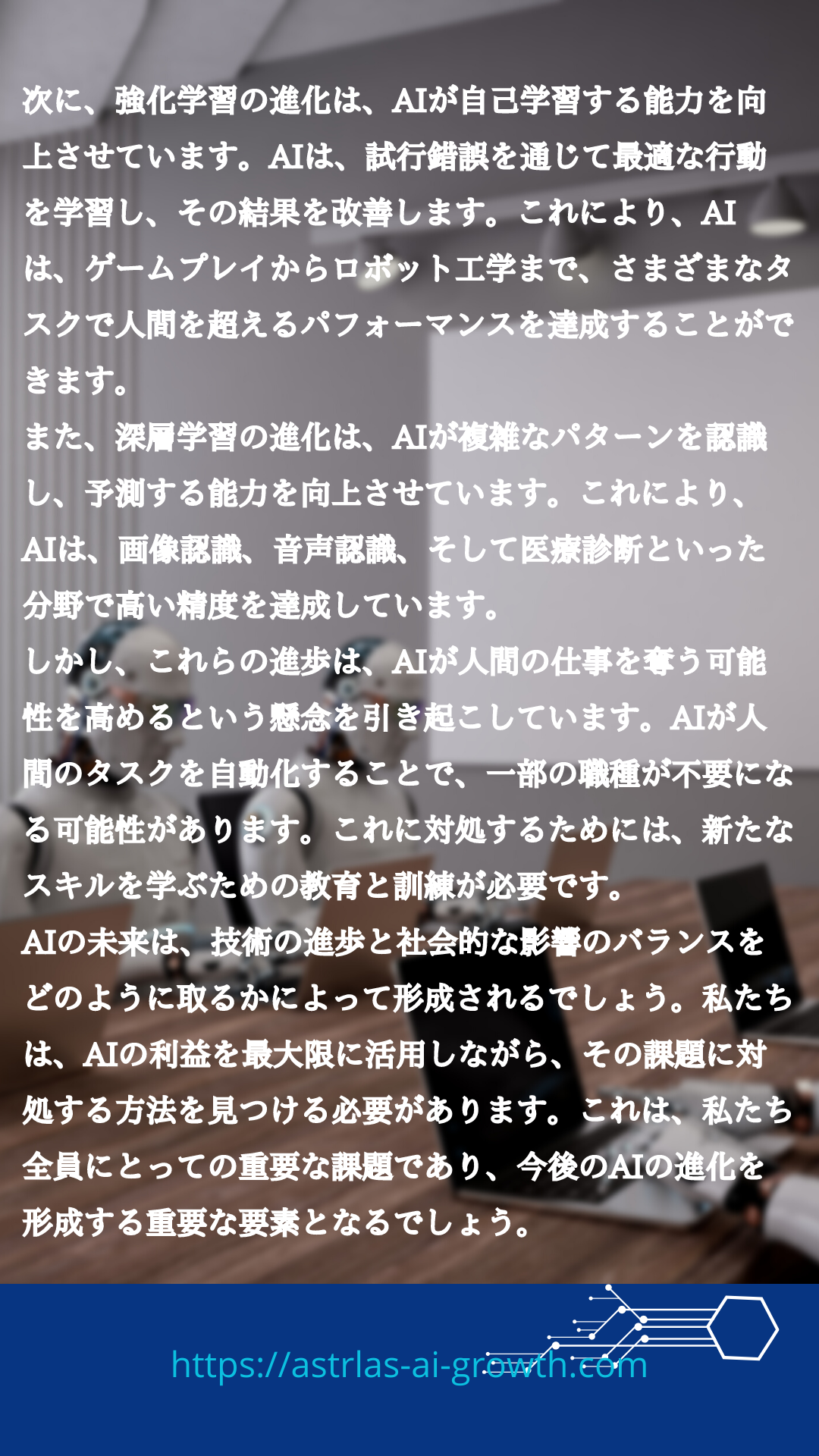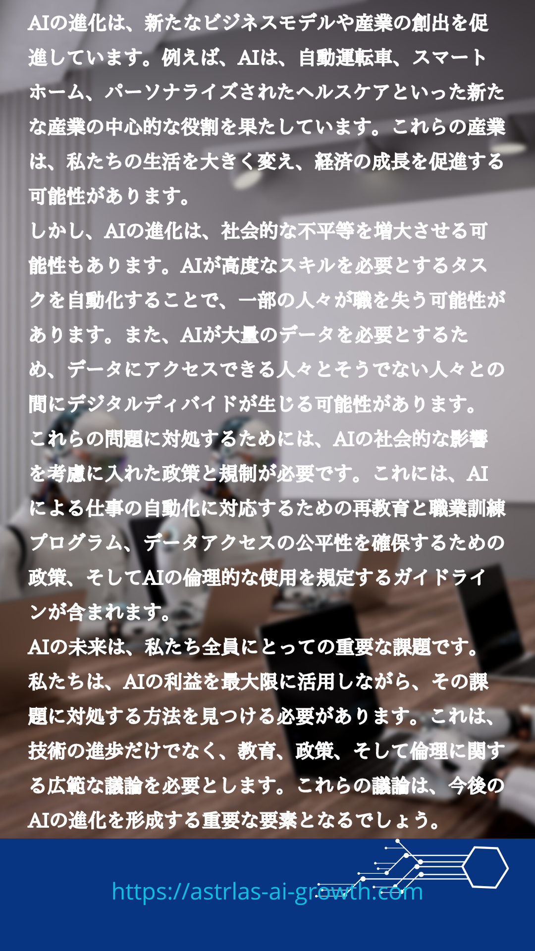 2023年の最新AI技術とその社会への影響 2024 7/26 BLOG ブログ投稿 AI記事 2023年7月15日2024年7月26日 2023年の最新AI技術とその社会への影響 社会にどういった影響が考えられるか? みんなで考える ← 戻るご回答をありがとうございました。 ✨ 名前(必須) メール(必須) サイト メッセージ 送信 関連 BLOG ブログ投稿 AI記事 2023年 AI AIコンサルタント chat-GDP コンサルタント ブログ 最新AI技術 社会への影響 長崎 長崎ビジネス よかったらシェアしてね! URLをコピーしました! URLをコピーしました! AIの進化 2023年の最新トレンドとその影響 AIを活用したこれから期待される業種ベスト10 この記事を書いた人 ASTRLAS AI ASTRLAS AI GROWTHは長崎を代表とするAIコンサルタント及び WEBからロゴ、動画、音楽などを制作する会社です。 個人から商店、企業まで幅広い顧客層で、デザインから戦略、ソリューション、SEOまでアドバイスとお手伝いをいたします。 コメント コメントする コメントをキャンセルコメント ※ 名前 ※ メール ※ サイト 次回のコメントで使用するためブラウザーに自分の名前、メールアドレス、サイトを保存する。
