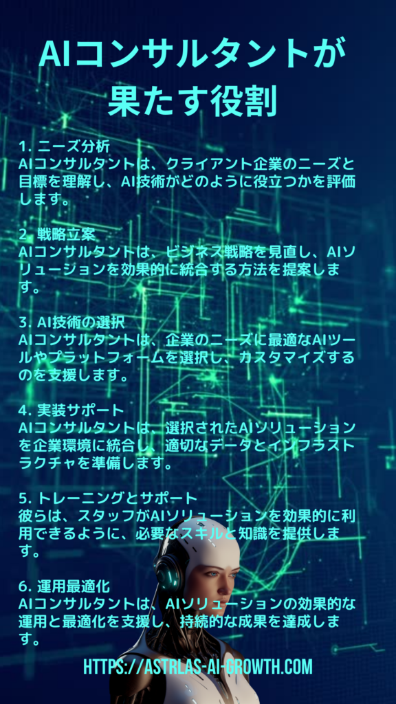 AIコンサルタント 未来への役割 2024 7/26 AI AIコンサルティング BLOG ブログ投稿 AI記事 2023年7月15日2024年7月26日 AIコンサルタント 未来への役割 AIコンサルタントとは?あまり今まで耳にしない言葉です。 これからの時代は必須になってくることを期待したいです。 当社FAQをご参照ください。 戻るメッセージが送信されました 名前(必須) 警告 メール(必須) 警告 サイト 警告 メッセージ 警告 警告。 送信 関連 AI AIコンサルティング BLOG ブログ投稿 AI記事 AI AIコンサルタント chat-GDP コンサルタント ブログ 人工知能 長崎 長崎AI 長崎ビジネス よかったらシェアしてね! URLをコピーしました! URLをコピーしました! 2030年までに起こる未来予想 TOPICS。AIとプライバシー:個人データの使用と保護についての新たな視点 この記事を書いた人 ASTRLAS AI ASTRLAS AI GROWTHは長崎を代表とするAIコンサルタント及び WEBからロゴ、動画、音楽などを制作する会社です。 個人から商店、企業まで幅広い顧客層で、デザインから戦略、ソリューション、SEOまでアドバイスとお手伝いをいたします。 関連記事 【2025年版】生成AI時代に生き残る武器は“AIスキル”|副業・仕事・教育に必須の習得ガイド 2025年4月17日 AIを副業で利用するおすすめツール 2024年1月22日 AI活用したビジネスの可能性。 2024年1月22日 予測分析と多機能AIの進歩:LangChainとLlamaIndexの比較と予測分析 2024年1月14日 AIとメタバースの組み合わせによる新たな動き 2024年1月13日 生成AIブームの継続とDXの進化 2024年1月13日 2024年のAI業界で注目すべき4大トレンド 2024年1月13日 AIとの共存の未来 2024年1月9日 コメント コメントする コメントをキャンセルコメント ※ 名前 ※ メール ※ サイト 次回のコメントで使用するためブラウザーに自分の名前、メールアドレス、サイトを保存する。